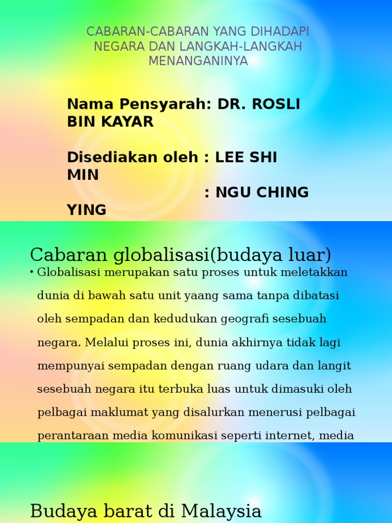 Salah satu cabaran hubungan etnik dalam aspek ekonomi ialah pemisahan fizikal. ISU DAN CABARAN SHAHAROM TM SULAIMAN SAIFUL FARIK MAT YATIN DR Pensyarah Kanan Fakulti Pengurusan Maklumat UiTM Puncak Perdana AJK Komuniti Buku Online Kertas kerja ini dibentangkan di Seminar Pencinta Buku Negeri Perak anjuran Bahagian Teknologi Pendidikan Negeri Perak pada 12-13 Okt. Read GLOBALISASI CABARAN BUDAYA DI MALAYSIA - RM2000 by Jabatan Kebudayaan dan Kesenian Negara on Issuu and browse thousands of other publicatio.